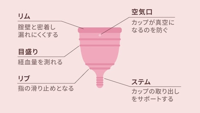 カップの縁にあたる部分をリム、本体下部の滑り止めの筋をリブと呼びます。使用するときは、カップを指で折りたたんで腟内に挿入し、内部で開いてフィットさせることで経血をしっかりキャッチします。