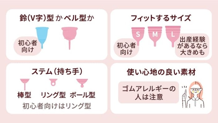 続いて、自分に合う月経カップを選ぶためのポイントを解説します。
