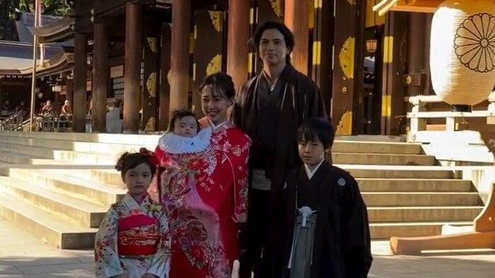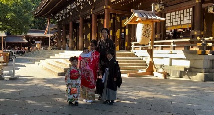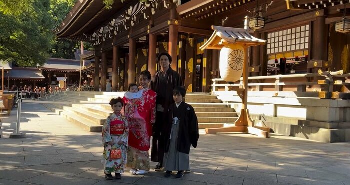 そんな川崎さんに寄り添うように、後ろには濃い色をベースにブラウンの着物姿のアレクサンダーさん、川崎さんの横には、袴姿の長男“カゲトラくん”、前には、赤い帯が目を引く長女“美人ちゃん”が立っていて家族全員、和装で統一された姿が印象的です。