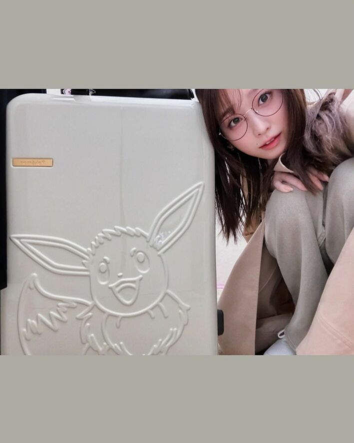 “イーブイ”が描かれた白のスーツケースの横には、しゃがんだ姿勢で撮影するメガネ姿の髙橋さんが!
