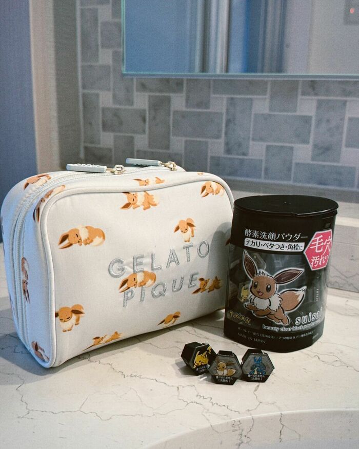 他にも、人気ブランドとコラボしたポーチや洗顔アイテムも公開しています。ポーチは“イーブイ”が丸くなって寝ているかわいらしいデザインになっていました。