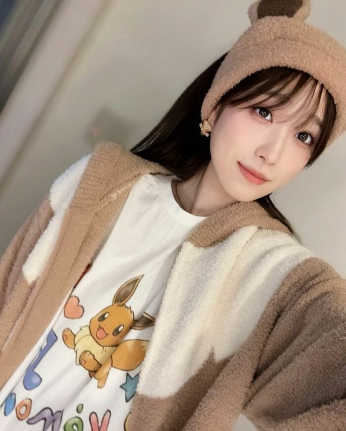 “イーブイ”になった姿も披露!耳がついたヘアバンドや茶色と白の“イーブイ”カラーのパーカーを着ています。中の白いTシャツには“イーブイ”が描かれていました。