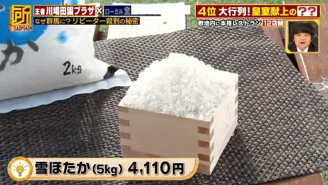 第4位の幻の皇室献上グルメとは、ミネラル豊富な武尊(ほたか)山の雪解け水と、昼夜の寒暖差で特別な甘みと味わいを生む、群馬県川場村産の幻のコシヒカリ「雪ほたか」。