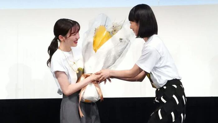 さらに、タナダ監督からは本作に登場するススキが入った花束が贈られると、永野さんは「なんてことですか、本当に。愛に溢れたチームとご一緒できてすごく幸せです。ありがとうございます」とコメントし、「すっかり忘れてた、自分の誕生日。23歳になります、大人です」と微笑みました。