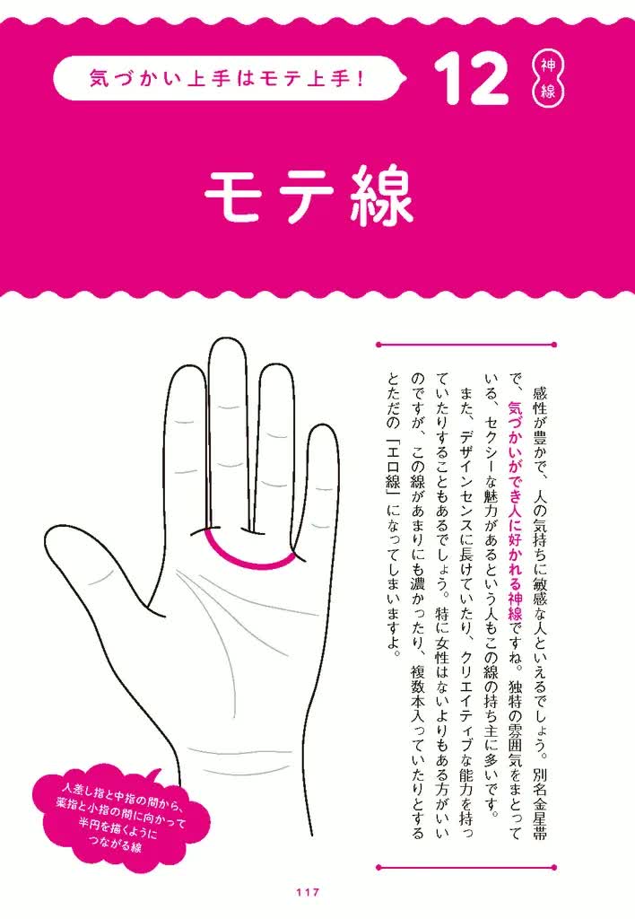 手の線を「これは〇〇線」と紹介している本はたくさんありますが、ではその線が自分の手に入っていなかったらその人はもう読むところがなくなってしまう。誰の手にもある基本の3本の線、感情線・知能線・生命線しかない人でも楽しめるように、「線がないということにもちゃんと意味がある」ということも伝えています。どんな手相の人にも楽しんでもらえるように作りました。