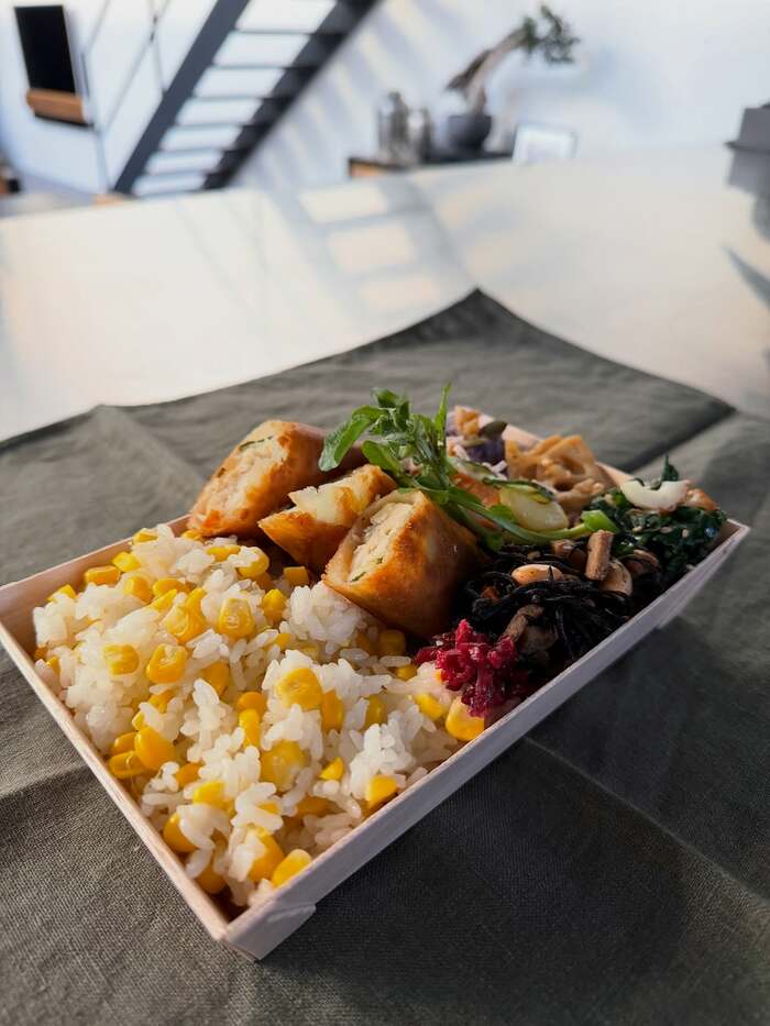 優しい甘さが染みこんだとうもろこしご飯は、こんがり焼き色がついた春巻きと相性抜群ですね。