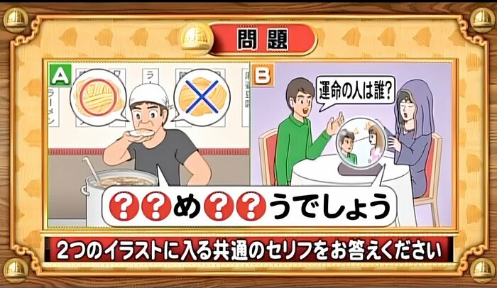 「??め??うでしょう」。2つのイラストに入る共通のセリフを答えてください。