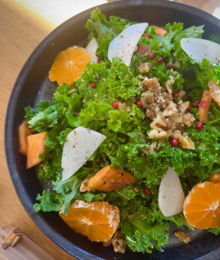 たっぷりのケールの上には、カブやミカン、ピンクペッパーなどが散りばめられ、彩り豊かでとってもオシャレ!見るからにみずみずしく、食欲をそそられます。