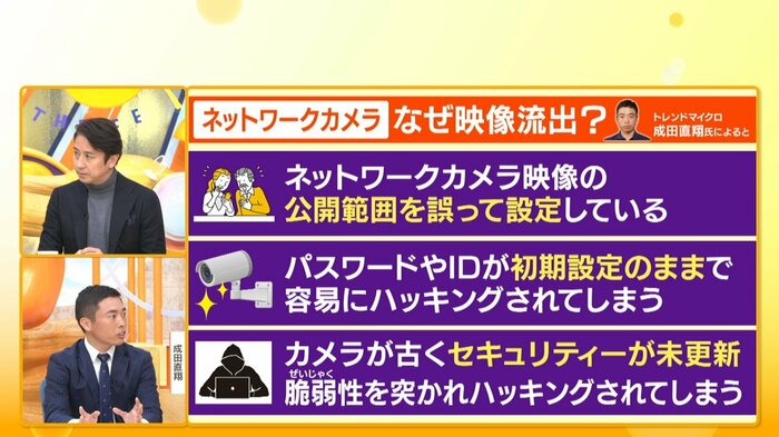 「トレンドマイクロ」の成田氏は、ネットワークに接続しているカメラの映像が流出する原因として以下のものがあげられるといいます。