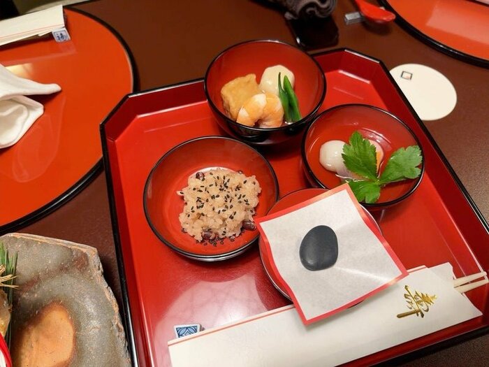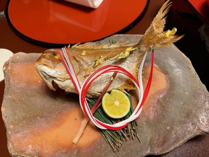 金箔や水引で豪華に飾られた尾頭付きの鯛やお赤飯、お吸い物が並んだ祝い膳を前に、