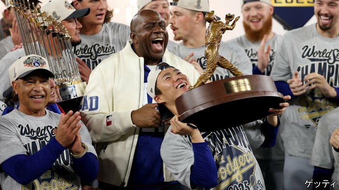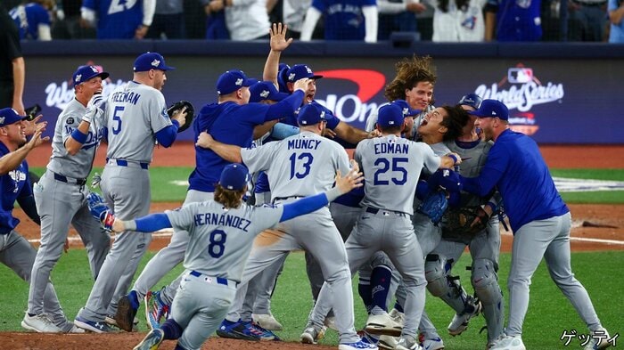 優勝決定の瞬間、ドジャースの選手が喜びを爆発させる中、カメラが捉えたのは、ブルージェイズの主砲・ゲレーロJr.選手。