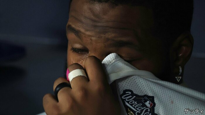 32年ぶりのワールドシリーズ制覇という栄光が目前ですり抜け、人目をはばからず、悔し涙を浮かべるゲレーロJr.選手。