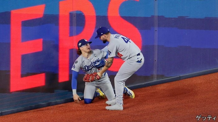 ぶつかりながらも、パヘス選手がキャッチし、ピンチを脱したドジャース。