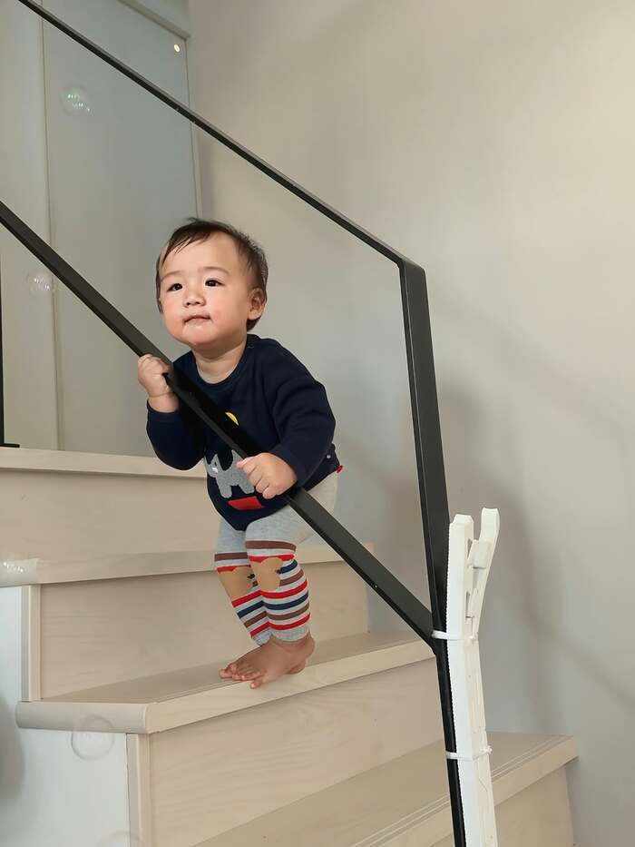 公開されたのは、階段の手すりを小さな両手でギュッと握りしめながら、つかまり立ちする陽太くん。