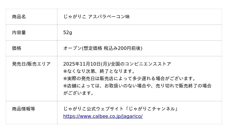 『じゃがりこ アスパラベーコン味』は、2014年に、当時の「じゃがりこファンサイト」である「それいけ!じゃがり校」の生徒たちがその商品企画のアイデアを出し合い、熱い情熱と共に生まれた商品でした。以来、親しみのある素材の組み合わせと奥深い味わいがファンから高く評価され、これまでに4度の発売がありました。そして、発売から約10年を経た今回の国民投票でも熱い支持を受け、このたび復活発売が決定しました。30年間愛され続けてきた「じゃがりこ」の歴史を彩る特別な味を、ぜひお楽しみください。