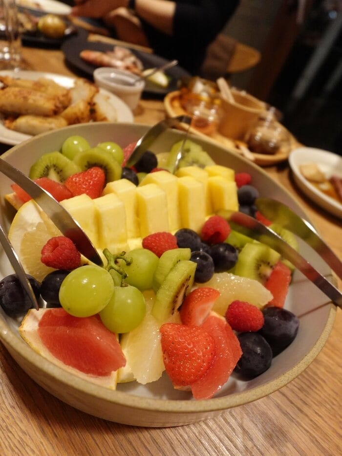キウイやグレープフルーツなど、みずみずしい果物がたっぷり盛り付けられた「友達と大人ハロウィン!」ショットと、にぎやかな様子がうかがえます。