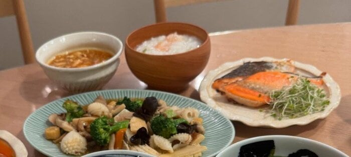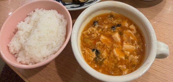 写真の一番手前は、ふっくら炊き上がったご飯、カップには豆腐やふわふわの卵が入ったスープが。「スープに酢を沢山入れて身体がポカポカ」と、肌寒い季節に合わせてアレンジを加えたんだとか。