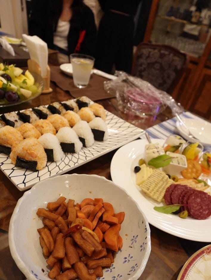 小さなおにぎりやチーズ・サラミなどのおつまみがテーブルに用意された「お友達の家で食べた夜食」ショットや…。