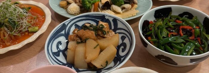 写真の真ん中辺りには、大根の煮付け物やピーマンと昆布のあえ物などがあり、ご飯が進みそうです。