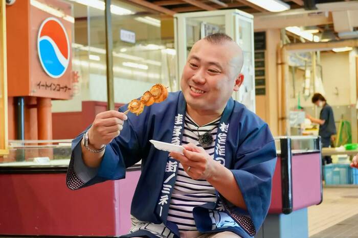 まずは、⾦沢の台所・近江市場へ。約300年にわたって⾦沢市⺠を⽀えてきたこの市場で、海産、フルーツなど、ざまざまな美味を堪能しながら、地元の⼈がおすすめしたいお店を聞き込み。