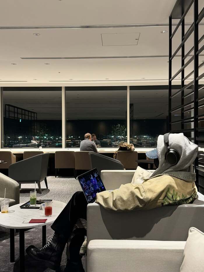 また、ラウンジと思われる場所のソファでくつろぐ姿も。