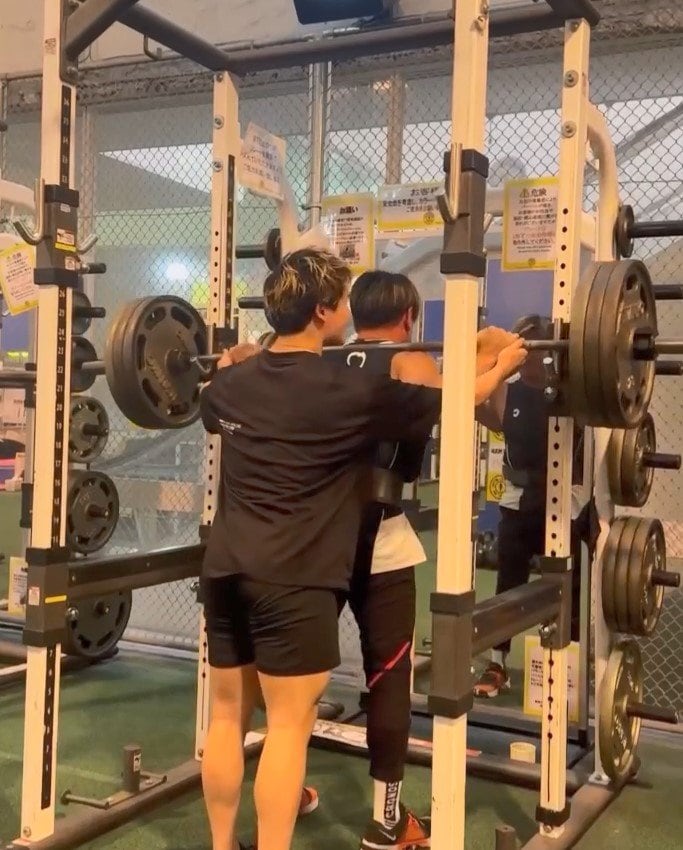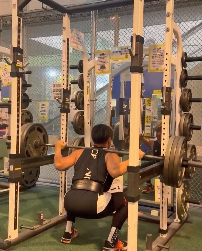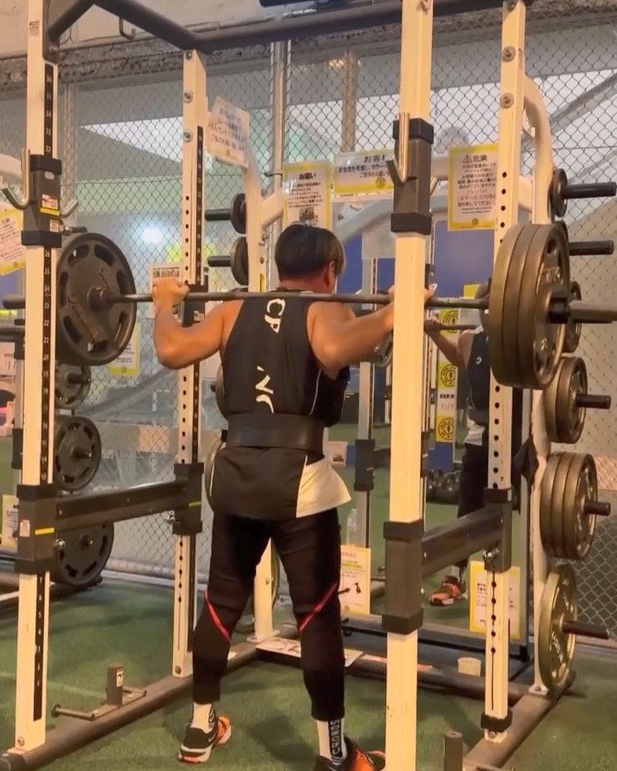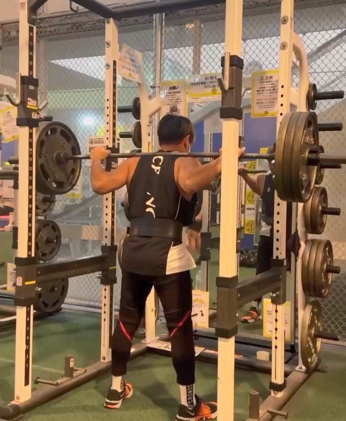 背中の上に重いバーベルを担いだ、トレーニングウエア姿の魔裟斗さん。
