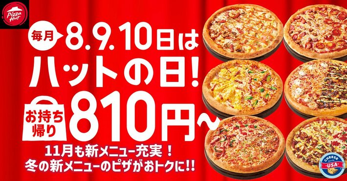 日本ピザハット株式会社(代表取締役会長兼社長:深瀬 成利、本社:神奈川県横浜市、以下:ピザハット)が展開する世界最大級のピザチェーン「ピザハット」は、毎月8日・9日・10日を「ハットの日」として、ピザハットの商品をお持ち帰り810円~でご提供するキャンペーンを実施しております。