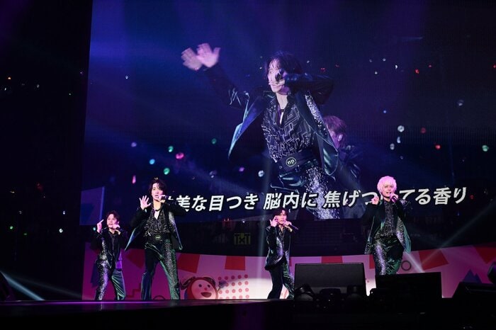 そして、全員がハンドマイクをヘッドセットに変えてサングラス姿になり、ちいかわとハチワレを呼び込んで「一緒に踊ろう!」と声をかけ、『Just Romantic!』へ。五関さんの「ここからはカッコつけて、スイッチ変えて。ミュージック…スタート」の声を合図に『Black Sugar』、『Perfect Sky』と華麗なステージを立て続けに披露。
