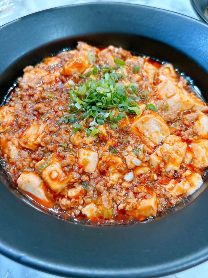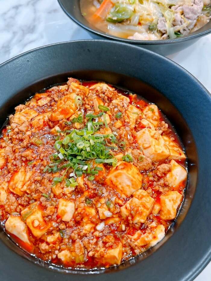 豆腐とたっぷりのひき肉が入って、ほどよく辛さを感じられそうな赤いタレが絡んでいることで、本格的な見た目に。