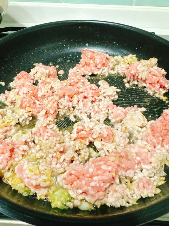 一緒にネギも入っていて、火が通り色が変わってきている様子から、すでにおいしそうな料理ができそうな期待が高まります。