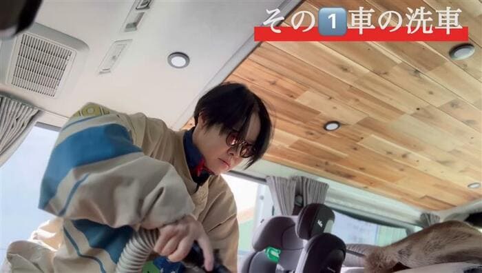 まずは、「愛車・ハイエースの洗車でございます」と、愛車の内装を披露。