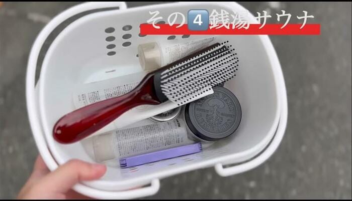 小さなカゴにヘアブラシや化粧品を入れて、ルンルンな様子で向かっていきます。