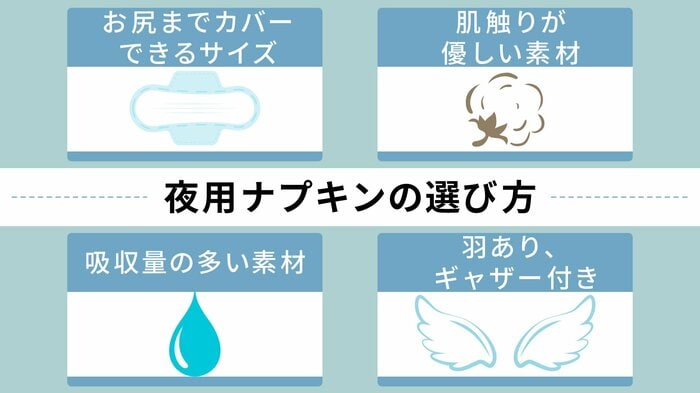 生理中も安心して眠るには、自分に合った夜用ナプキンを選ぶことが大切です。夜用ナプキンを選ぶ際に気をつけたい4つのポイントを解説します。