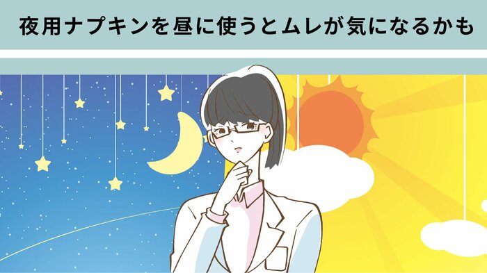 夜用ナプキンは昼間も使えますが、日中は立ったり歩いたりと体を動かす時間が多く、汗もかきやすいため、ムレて不快に感じてしまう場合もあります。昼間に夜用ナプキンを使うときは、長時間の使用を避けたほうがよいでしょう。