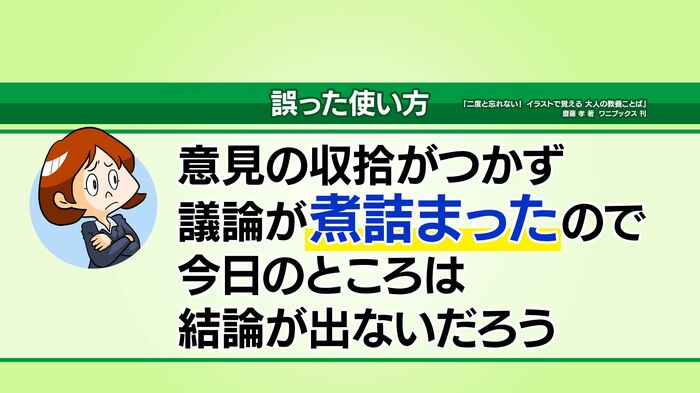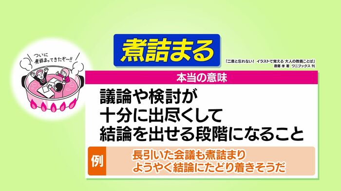 「煮詰まる」という言葉が指すのは、「議論が十分に出尽くして、結論を出せる段階になった」状態。齋藤先生は「行き詰まる」と勘違いして使われているのではないかと推測し、「せっかくのいい言葉なので、明るい感じに使って欲しい」と訴えました。