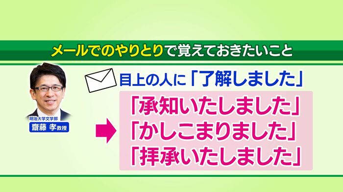 「目上の人には『了解しました』ではなく、『承知しました』『かしこまりました』『拝承いたしました』などを使う」という、メールで覚えておきたいルールも紹介されました。