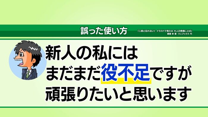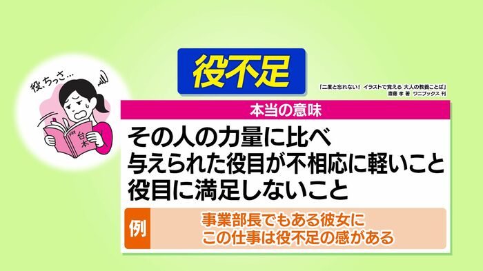 齋藤先生によると「力不足」と間違えて覚えている人が多いようで、基本的には「第三者が見て『あの人には役不足だ』というふうに使う言葉」なのだそうです。