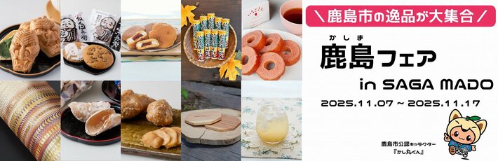さが県産品流通デザイン公社(所在地:佐賀市、所長:石井法子)は、佐賀県の県産品を厳選したセレクトショップ「SAGA MADO」において、2025年11月7日(金曜日)~11月17日(月曜日)の11日間、鹿島市の特産品を集めた「鹿島フェア」を開催します。