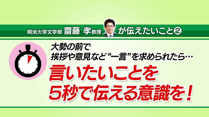 「大勢の前で挨拶などをするときに備えて、言いたいことは5秒で伝える訓練を。そうすると、『えーと』や『あのー』などが減って相手に伝わりやすくなる」という齋藤先生の主張に従い、スタジオではお題に合わせて5秒間スピーチに挑戦しました。