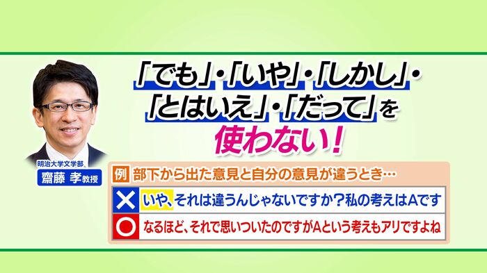 「大人だな」と感じさせるためには、「常にポジティブ意識で場を盛り上げることが必要」と考える齋藤先生によると、「でも」「いや」「しかし」「とはいえ」「だって」は使わないほうがいいそうです。