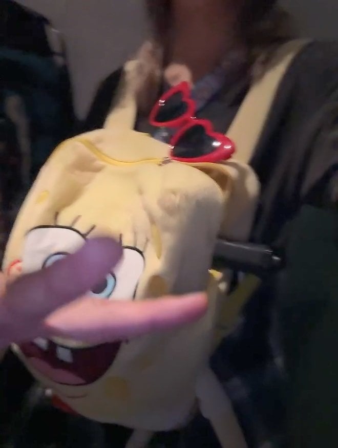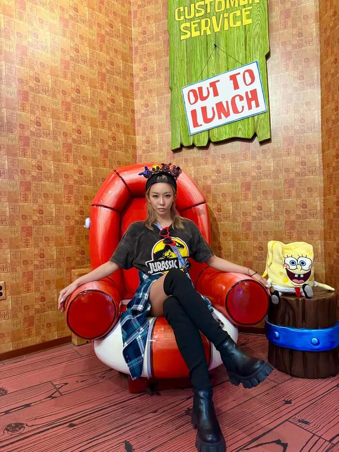 そんな倖田さんのTシャツに注目してみると、ジェラシックパークのロゴがデザインされています。そして、常に身につけていたスポンジボブも、倖田さんの横にちょこんと着席。