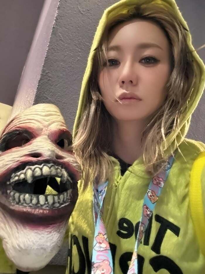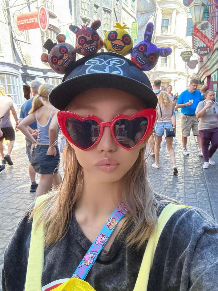 パーク内での自撮りショットでは、赤い縁のハート型サングラスをかけ、唇をとがらせる倖田さんの姿が。頭には、ハロウィン仕様のキャラクターカチューシャも付いており、ハロウィン気分を高めてくれているようです。