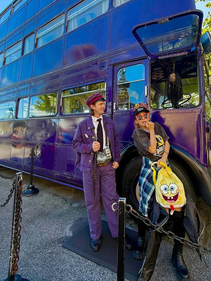 ハリー・ポッターエリアで撮影されたと思われる1枚には、縦に長い紫色のバスを背にした倖田さんの姿も。