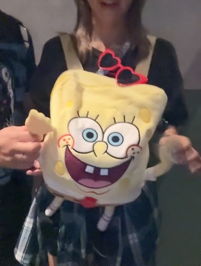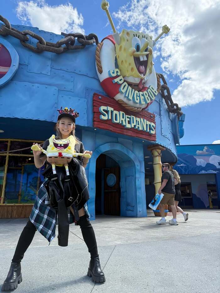 スポンジボブのショップの前で、満面の笑みを浮かべるショットも披露しています。