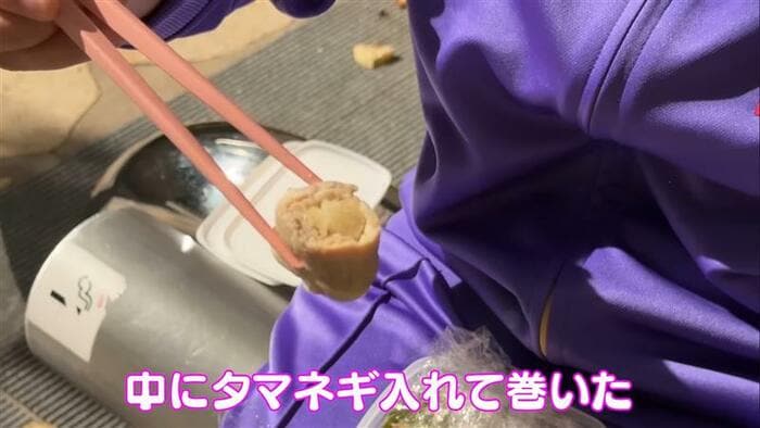 玉ねぎを肉で巻いたものが。「もうちょっと野菜を食べた方が良いんだろうな」と、メニュー内容の改善点も見つけたようです。