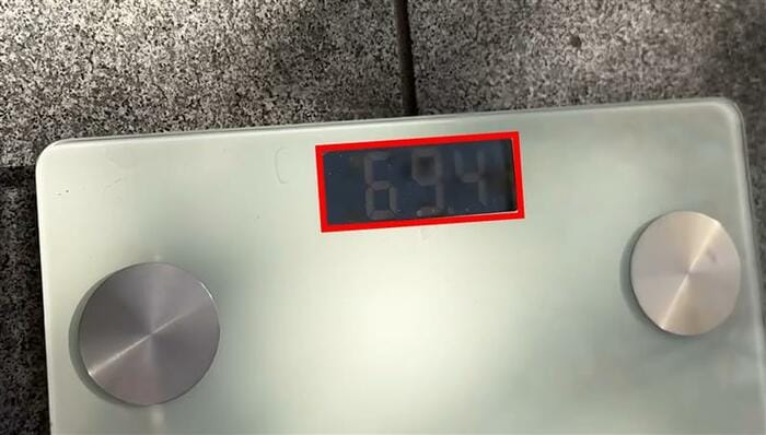 スタッフが用意した体重計に実際に乗ってみると「69.4kg」と表示。