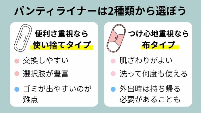 パンティライナーには、“使い捨てタイプ”と“布タイプ”の2種類があります。普段の過ごし方や悩みに応じて選ぶとよいでしょう。