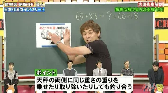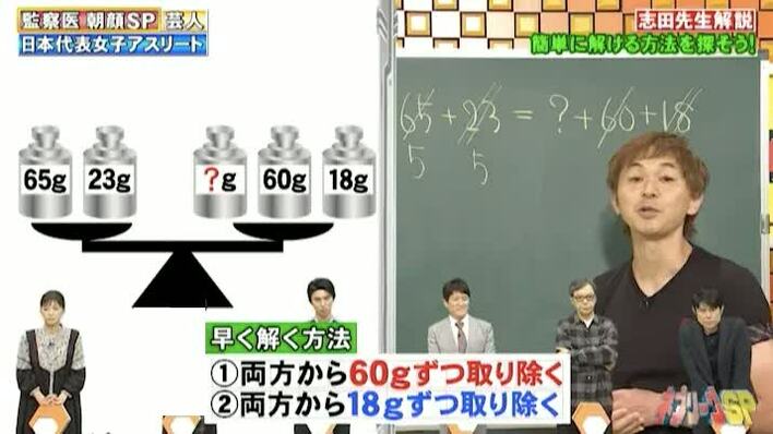 天秤の左右の重さを均等にするためには、何gの重りを乗せればいいのかを10秒ほどで計算する問題では、数学担当の志田晶先生が簡単な計算方法を教えてくれました。