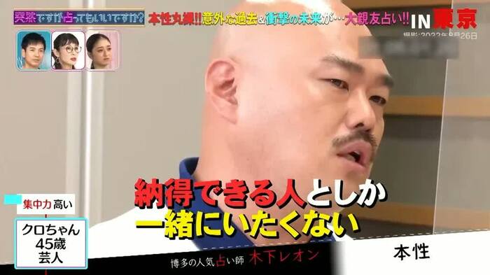 9月26日(月)放送の『突然ですが占ってもいいですか?』(フジテレビ)で、高橋さんとクロちゃんが、木下レオンさんに占われました。