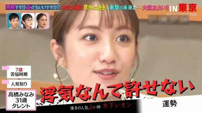 高橋さんは、2019年に15歳年上の一般男性と結婚しました。レオンさんが、魔六殺の時期に「旦那さんの浮気が出てきやすい」と告げると、高橋さんは「浮気は許せないよ」とピシャリ。